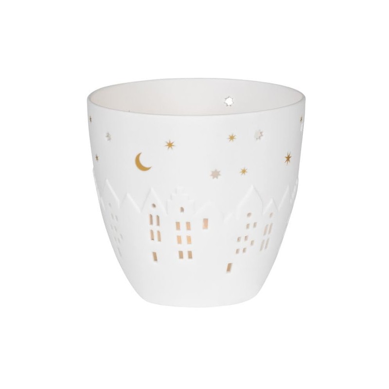 In the poetry light houses you can insert a tea light and enjoy relaxed candlelight. It is made of unglazed porcelain and a hole pattern through which the candle light can shine.