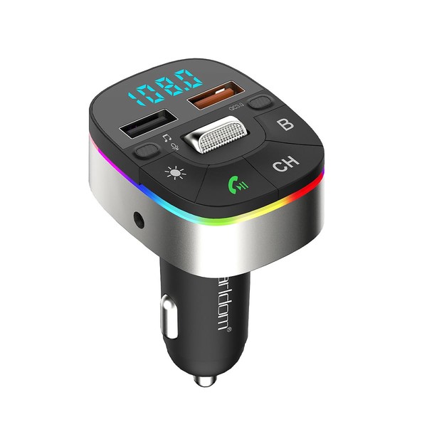 POFET Bluetooth Car Adapter, FM Bluetooth 5.0 Transmitter for Car, QC3.0 Car Charger with 7 Color Lights, Support Hands-Free Calling