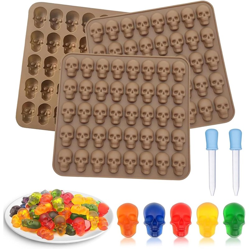 Pofflujent 3 Pcs Skull Gummy Silicone Mold skull Chocolate Silicone mold Halloween Mini Skull Mold with 2 Droppers for Chocolate, Candy, Jelly, Ice Cube (5)