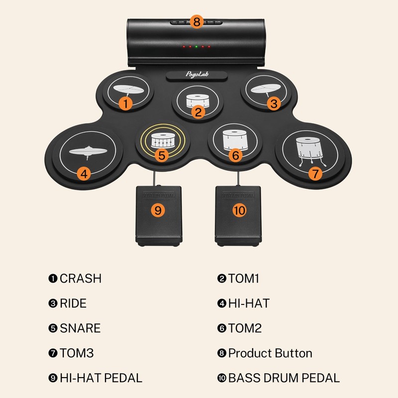 - BEGINNER'S 7 PADS DRUM SET --- The digital drum set has 7 drum pads (1 CRASH, 1 RIDE, 1 SNARE, 1 HI-HAT, and 3 TOMS). Each drum pad has a simple and clear pattern, making it very friendly to young beginners or adults.