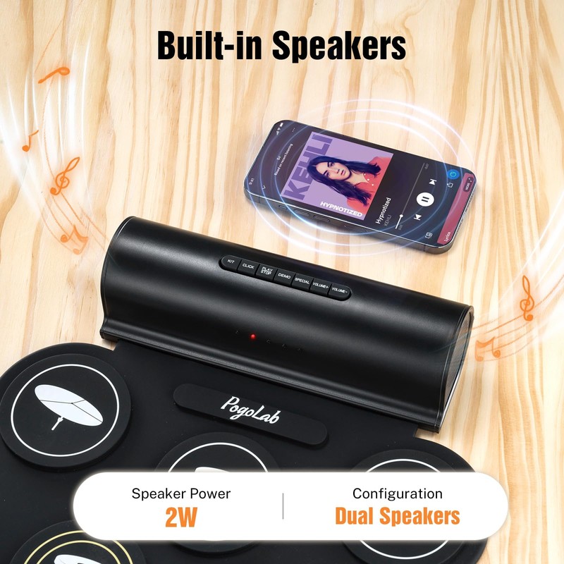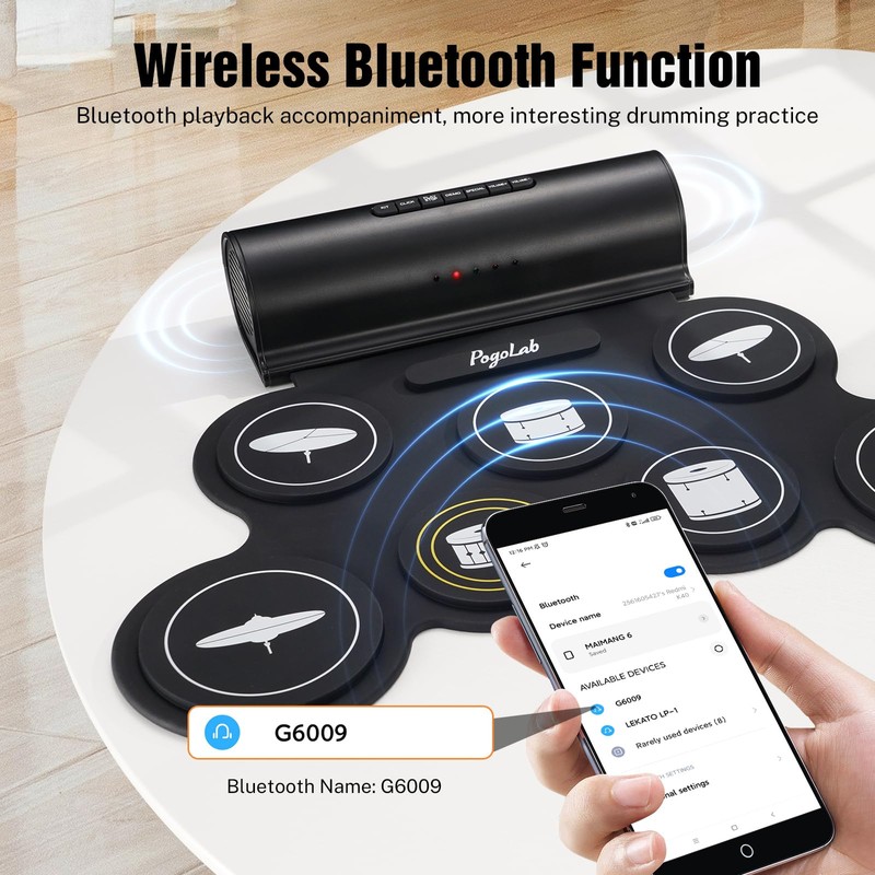 - ELECTRIC DRUM SET WITH BLUETOOTH --- POGOLAB beginner drum kit built in wireless function (wireless name: G6009), easily connected, play music accompaniment. Practice drumming while listening to your favorite music for a richer and more interesting drumming experience.