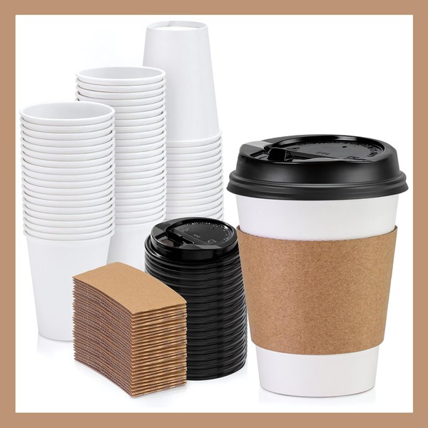 Pokanic Paper White Cups [12 oz] with Lids and Sleeves x [50 Set] Disposable Hot Cold Coffee Water Beverage Drinking for School Office Home Kitchen Cafe Restaurant (50 Pack, 12 oz)