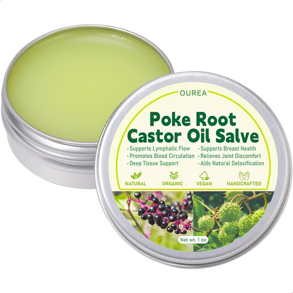 Poke Root Castor Oil Salve, Organic Lymphatic Support Massage Balm, Deep Tissue Ointment for Cyst, Boils, Breast, Fibroids, Swollen Lymph Nodes & Joint, Natural, Vegan - 1 Oz