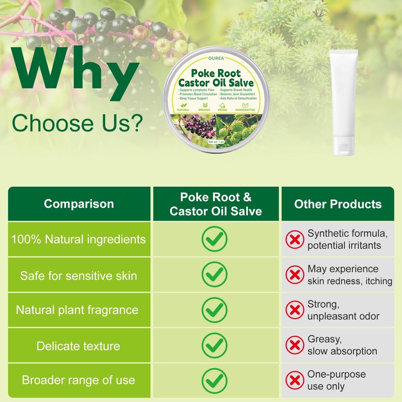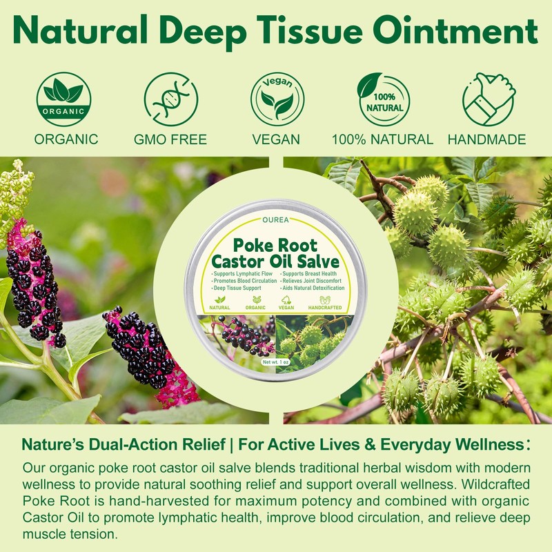 • Deep Tissue & Joint Relief: Tired of lingering tension? Our poke root & castor oil salve penetrates deeply to soothe joint pain, muscle tightness, and inflammation. Perfect for daily relief, post-workout recovery, nighttime relaxation, or deep massage—your natural tool for long-term body care