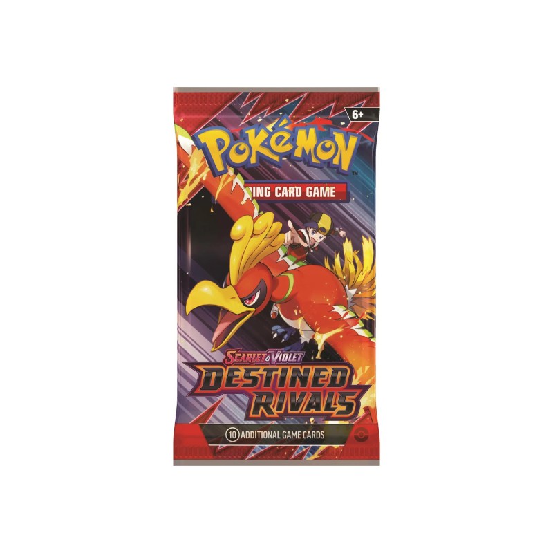 Please note; this item is assorted, styles vary. Customers will receive one randomly chosen booster design per order Whose Side Are You On? Pokémon Trainers, be on high alert! The nefarious Team Rocket is setting its latest plan into motion, and heroic Trainers are racing to stop it. Join forces with the likes of Cynthia and Garchomp ex, Ethan and Ho-Oh ex, or Arven and Mabosstiff ex… Or reconsider your loyalties and fight alongside Team Rocket’s Pokémon like Mewtwo ex—under the command of Giovanni! Choose a side, assemble your allies, and battle boldly in the Pokémon TCG: Scarlet & Violet—Destined Rivals expansion!