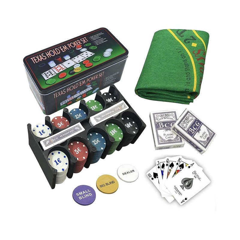 - Contents: This blackjack and poker set contains 2 decks of 54 cards each, a play mat, 200 poker chips, an organiser to keep the chips tidy, 1 dealer button, 1 blp button, 1 large button and a instruction book for playing poker