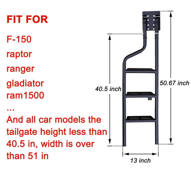 - [Application] Compatible with pickup truck models, Universal fit tailgate ladder. It makes your climb and work easily, safely, and more efficiently; The length of the ladder 40" can be extended about 2 inch, as a 42" ladder, will fit for most trucks, such as F150, RAM 1500, Tacoma, etc.; Note: Only suitable for the vehicles that the height from the tailbox to the ground is no more than 42 inch and the tailgate width is not less than 51 inch