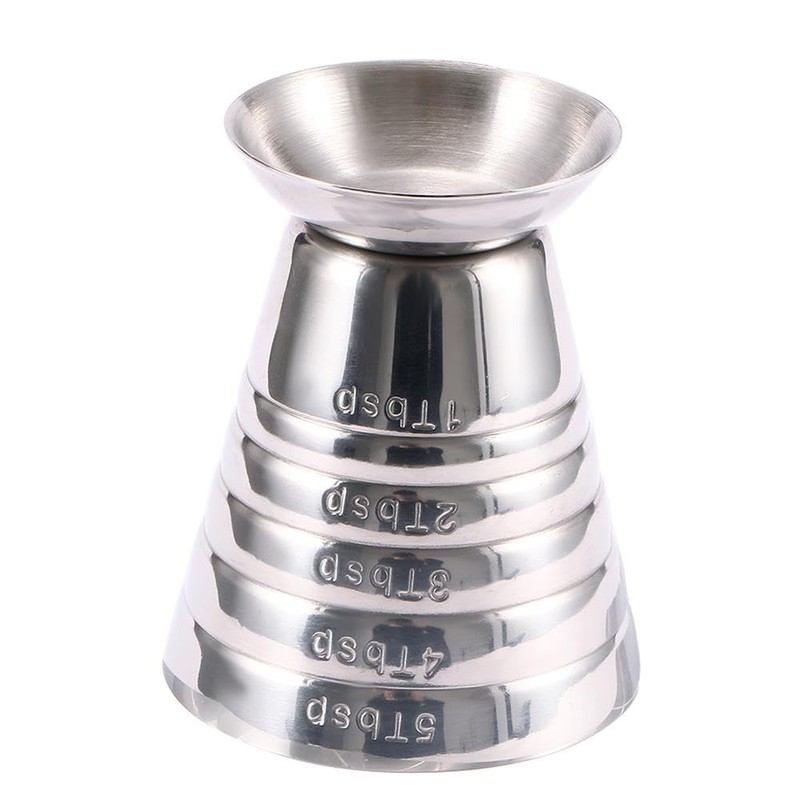 Measures: 0.5oz, 1oz, 1.5oz, 2oz, 2.5oz & 15ml, 20ml, 30ml, 45ml, 60ml 75ml & 1Tbsp, 2Tbsp, 3Tbsp, 4Tbsp, 5Tbsp
