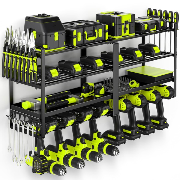 - 【Extra Large 8 Drill Holders and 4-Layer Capacity】- This power tool organizer wall mount is designed to store 8 cordless drills on the bottom tier, with three additional layers for storing heavy tools, small accessories, and added slots for hammers, pliers, and screwdrivers. It's the perfect solution for organizing your cordless tool organizer needs.