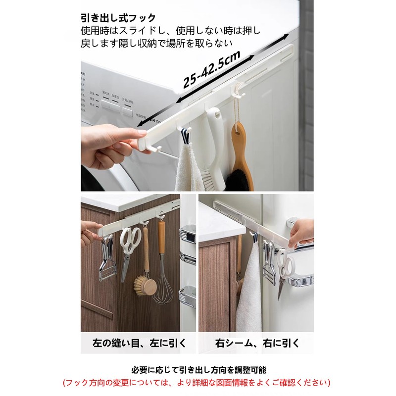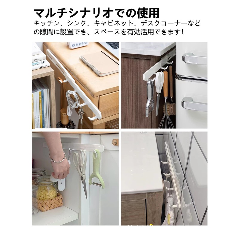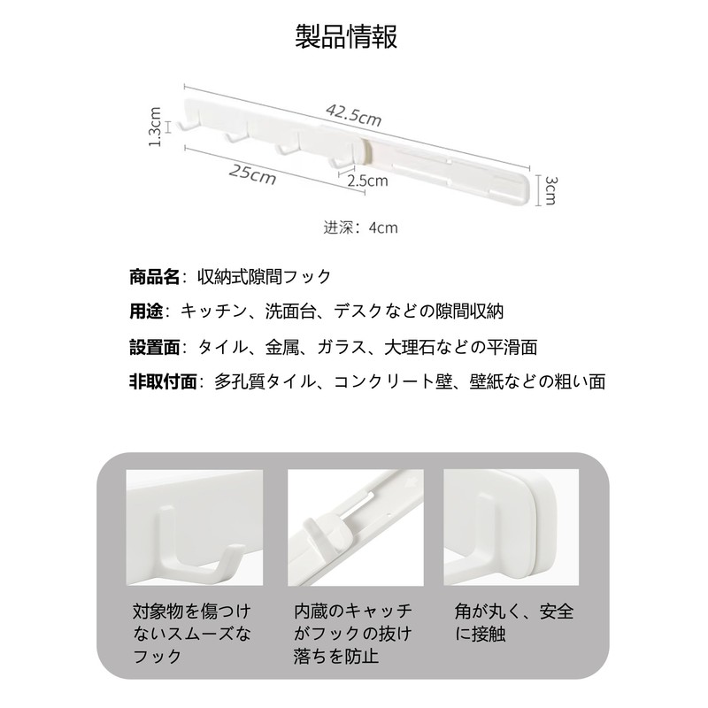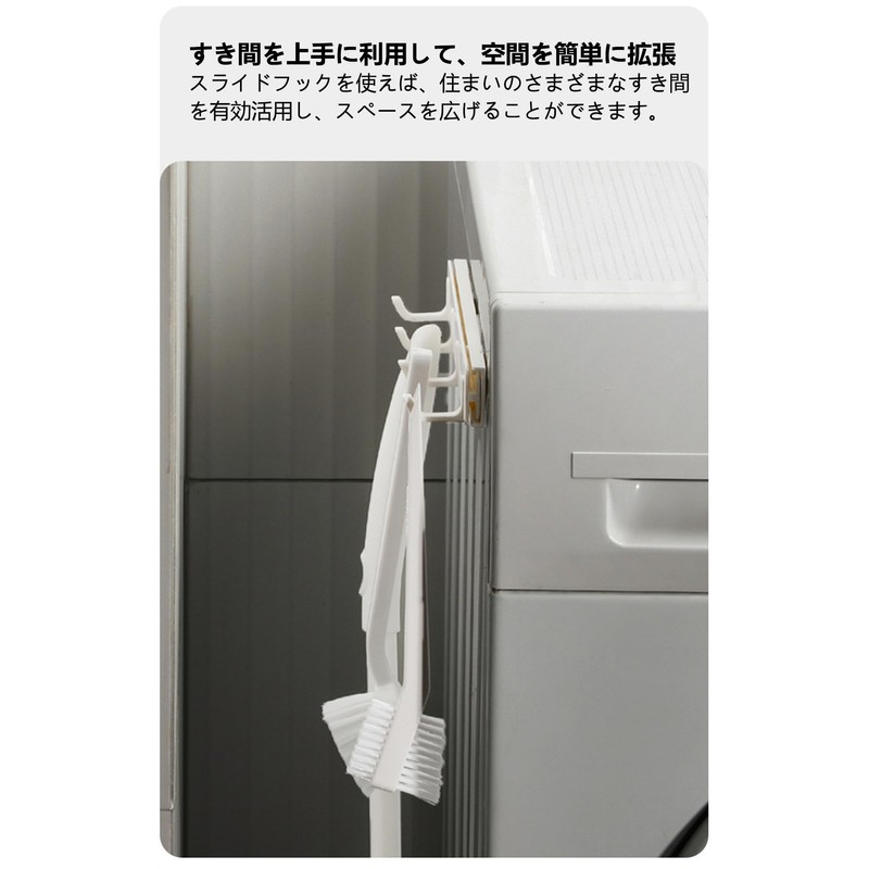 - Space-saving: The sliding hook allows you to place it in a narrow gap such as bathrooms, kitchens, and desks, making efficient use of space for storage