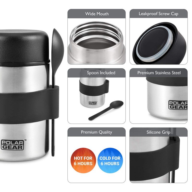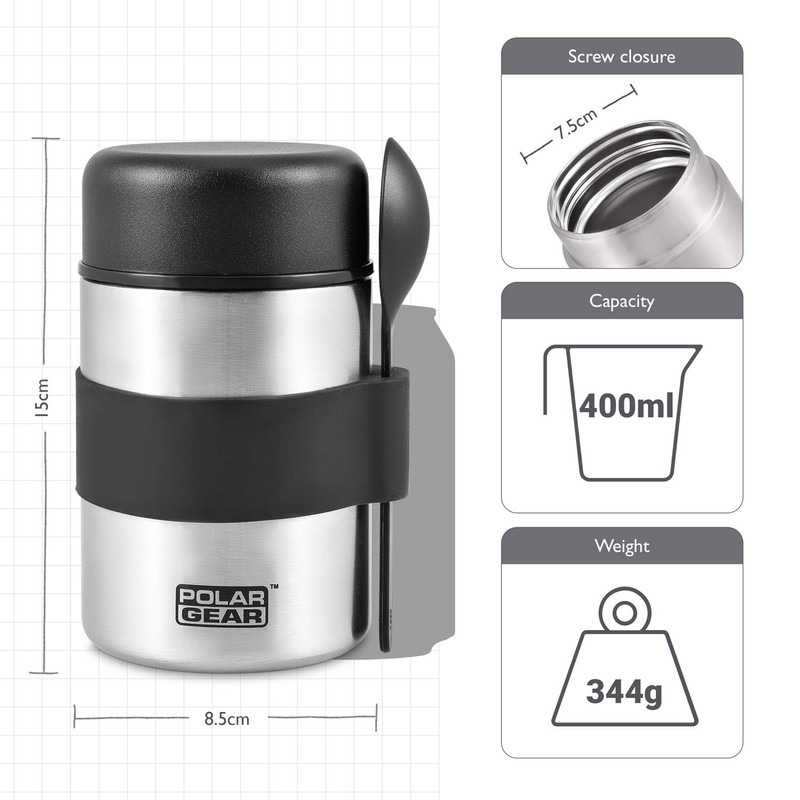 - Fix your lunch time cravings with a nice hot meal: Bored with sandwiches for your packed lunch? Got a long trip tomorrow and want something easy to reach while travelling that leaves no food waste or packaging to dispose? Polar Gear's hot container and food flask is perfect for varying your pack-up routine. With 400ml capacity, our insulated flask perfectly fits a tin of soup. Our hot to the last bite container also suits stews, porridge, leftovers and other warm meals to jazz up commuting.