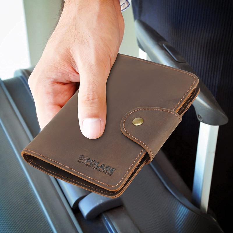 Polare Full Grain Leather Slim and Soft RFID Blocking wallet For Men Snap Bifold Travel Wallet Passport Holders 2 Passports (Dark Brown)