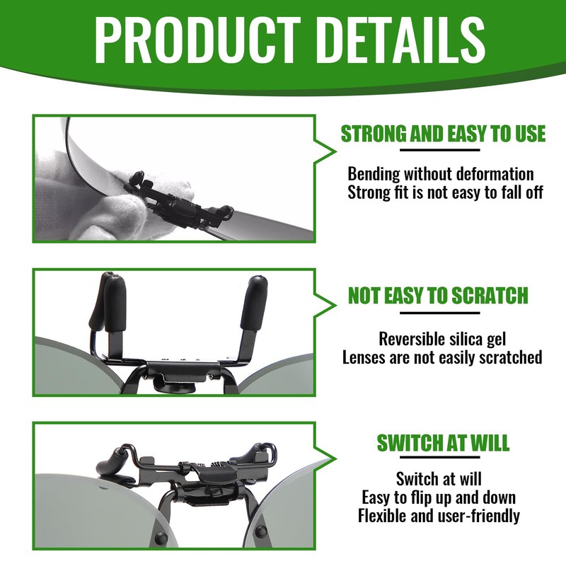 - ELEGANT & MODERN STYLE With its elegant dark green color, this sun clip adds a touch of style to your daily look. Whether on a city stroll, a mountain hike or a trip by the sea, it fits perfectly with your outfit. Stay fashionable and protect your eyes from the harmful effects of the sun.