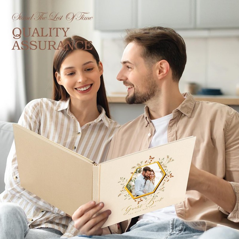 - 【Durable Hardcover Linen Guestbook】The hardcover wedding guestbook is wrapped in linen, which is more durable and can protect your guestbook for a long time. This guestbook contains 100 sheets of paper and features a lay-flat binding design that makes your writing a breeze. The 7*10 inch size easily accommodates sweet photos and well wishes on the same page. This guestbook also comes with a metal pen and photo corner stickers.