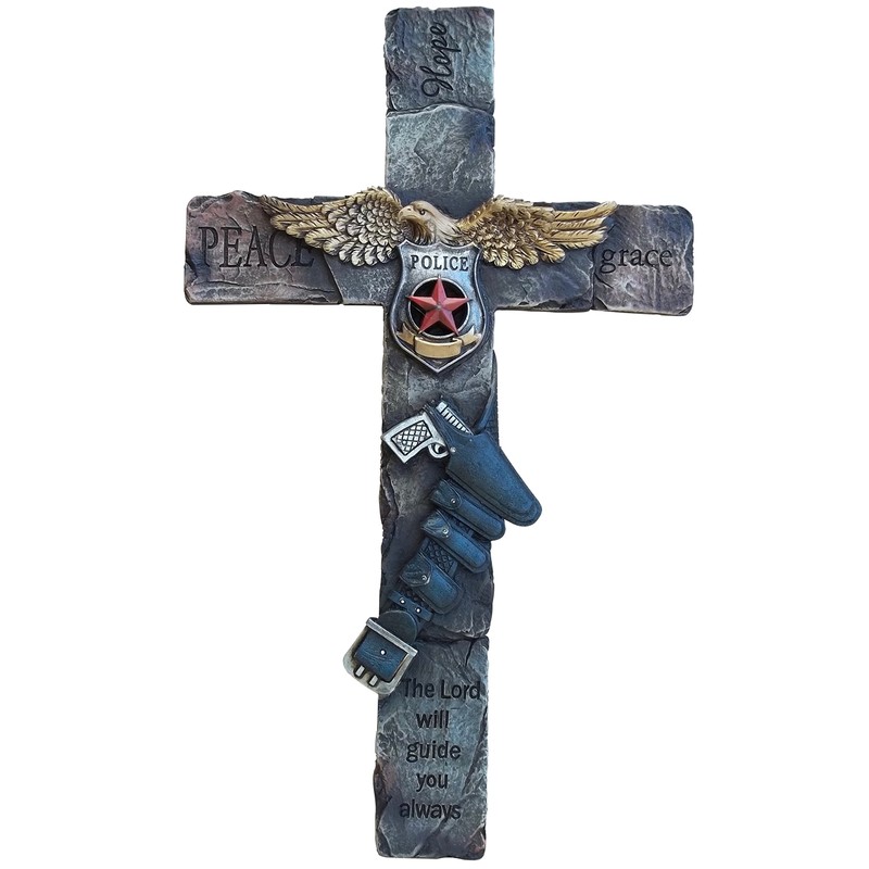 - Comforting Bible verses and promises are combined with police duty gear on a hand-painted cross.