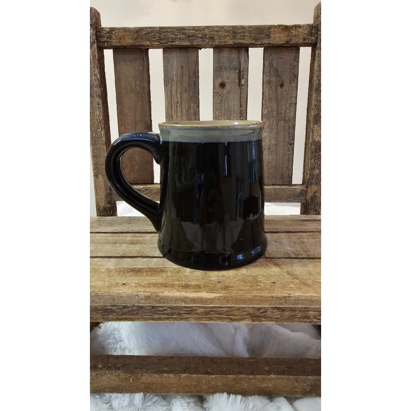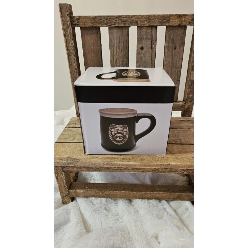 Hand-painted porcelain black mug with a tan rim. Embossed badge symbol is in the center with "PD Police Officer" recessed in black. Interior is tan and handle is black.