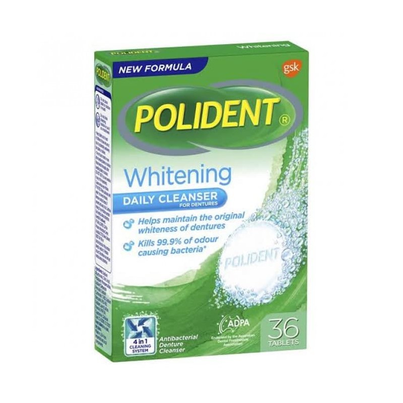 Polident Whitening Denture Cleanser: Restores dentures to their original whiteness, Kills 99.9% of odour causing bacteria, Helps remove plaque and stubborn stains, Non-abrasive so it cleans without scratching, Leaves dentures minty fresh, Suitable for full and partial dentures. For added confidence and comfort use Polident Denture Adhesive every day. Polident Whitening Denture Cleanser Tablets includes a Micro Clean Formula and are endorsed by the Australian Dental Prosthetists Association.
