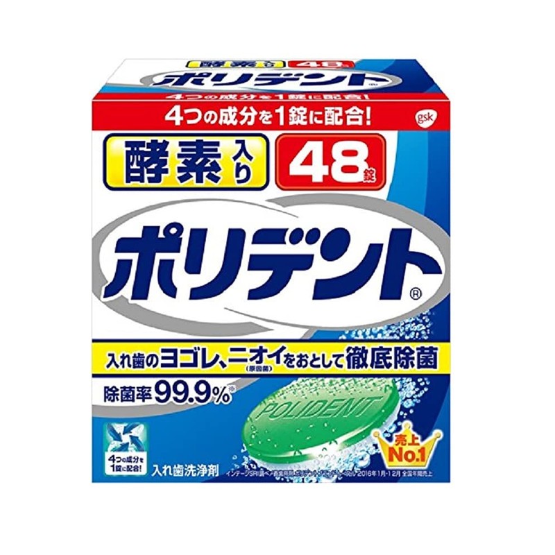 - 4つの成分を1錠に配合した入れ歯洗浄剤。強力除菌・速効洗浄・漂白促進・着色汚れ落とし