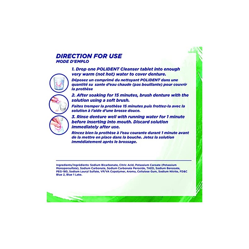 Polident Antibacterial Daily Cleanser denture tablets kill 99.9% of odour-causing bacteria. It helps remove stubborn stains and helps reduce plaque build up leaving your dentures or partials cleaner, fresher and brighter every day. Unlike some toothpaste, Polident Daily Care have a non-abrasive formula, so they clean without scratching and leave fewer places for unwanted bacteria and other microorganisms to grow. Using Polident denture cleaner, as part of a daily oral health routine, helps contribute to good oral health and maintains healthy gums and mouth