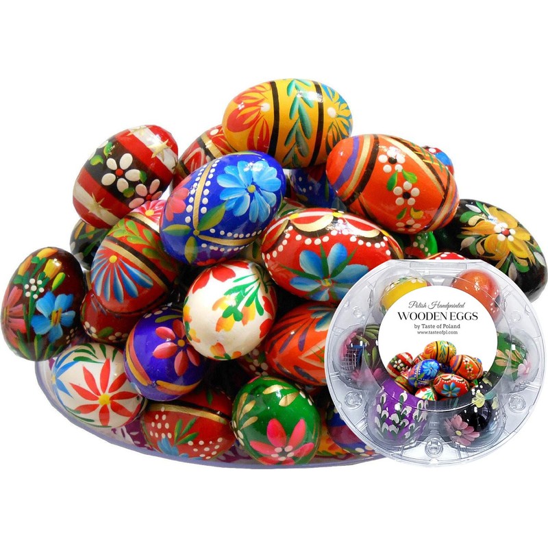 Decorate your table or fill your Easter basket with these set of 7 beautifully hand-painted and vibrant wooden eggs from Poland. One of the best-known Easter symbols is the egg, which has symbolized renewed life since ancient days. The egg is said to be a symbol of life because in all living creatures life begins in the egg. That symbol, the hand-painted egg in various colors and patterns, became the most popular Easter gifts shared among friends and family members. A bowl of Easter eggs would also be set out in the house, to protect against misfortunes. Become part of ancient tradition by sharing these colorful Easter gifts with your friends and family! The 2.5" long wooden eggs are made of natural wood, hand-painted and finished with hi-gloss varnish. Being solid and sturdy, the eggs will last for generations. No two wooden eggs are identical since they are handmade in Poland. Eggs come in a variety of colors and designs, please allow us to make a selection for you. Packaged in eco-friendly plastic carton that prevents each egg from banging about and is perfect for safekeeping the eggs for the years to come. Made in Poland.