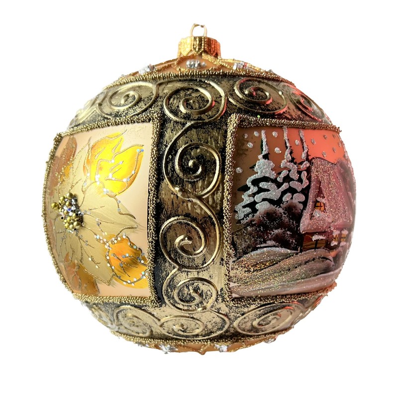 Polish Gallery Christmas Ornament, Winter Charm View with Poinsettia, Blown Glass Ball (150mm / 6 Inch, Gold)