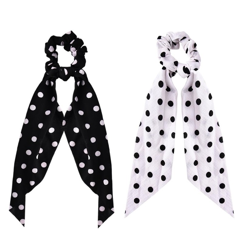 Polka Dot Ribbon Scrunchies for Women Girl Bowknot Ponytail Holder Elastic Hair Band Tie Stretchy Long Tail Hair Accessory 2 Pcs Black White Polka Dot Chiffon Hairband Rubber Band Accessories
