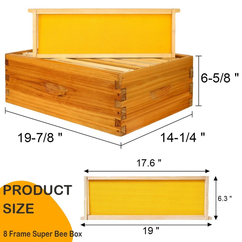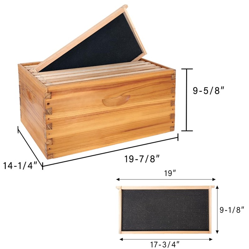 • Standard Beehive Dimension-Deep brood boxes (19-7/8″ x14-1/4″ x 9-5/8″), medium super bee boxes (19-7/8″ x 14-1/4″ x 6-5/8″)