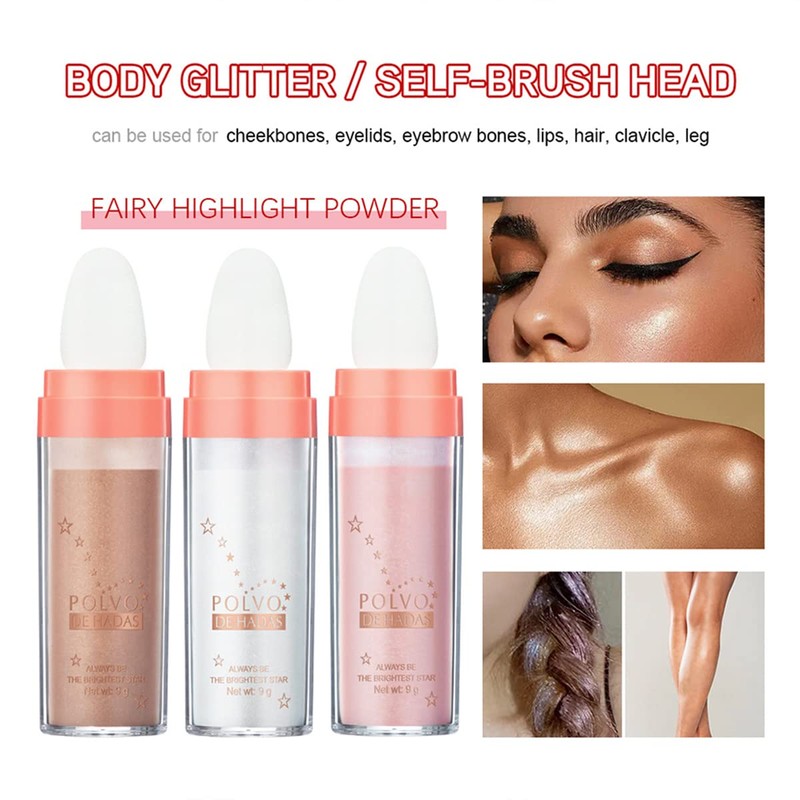 - 💎【Multi-usages】The Polvo De Hadas not only can be used for face make like glitter eyeshadow and cheek blush, but also can as body glitter for the neck, collarbone, legs, and any area you want to shine. The highlight puff stick is available in 3 colors for you to choose the corresponding color according to your favor.