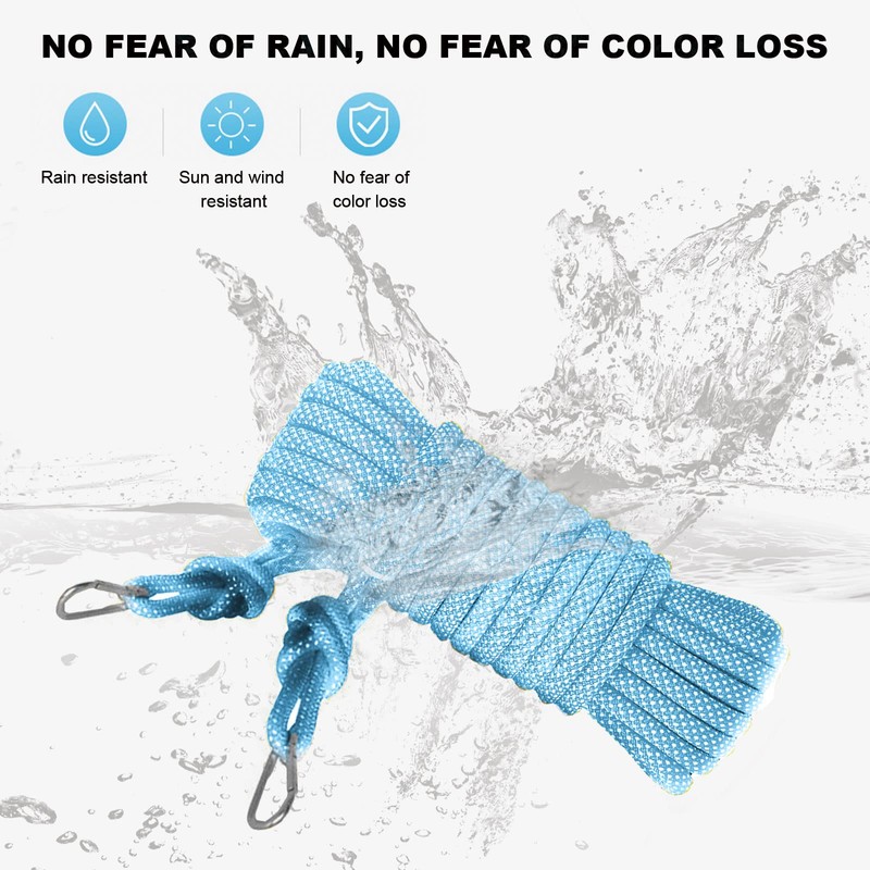 The washing line rope has two metal hooks, which is more powerful to fix the rope and will not fade,
