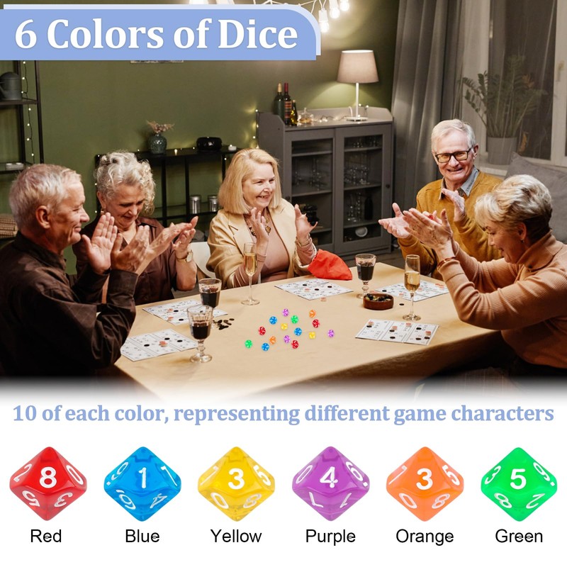 - Rich in colour: dice set contains 60 dices: red, purple, orange, green, yellow, blue (10 pieces/colour), 6 colours, you can easily sort and play role play while playing