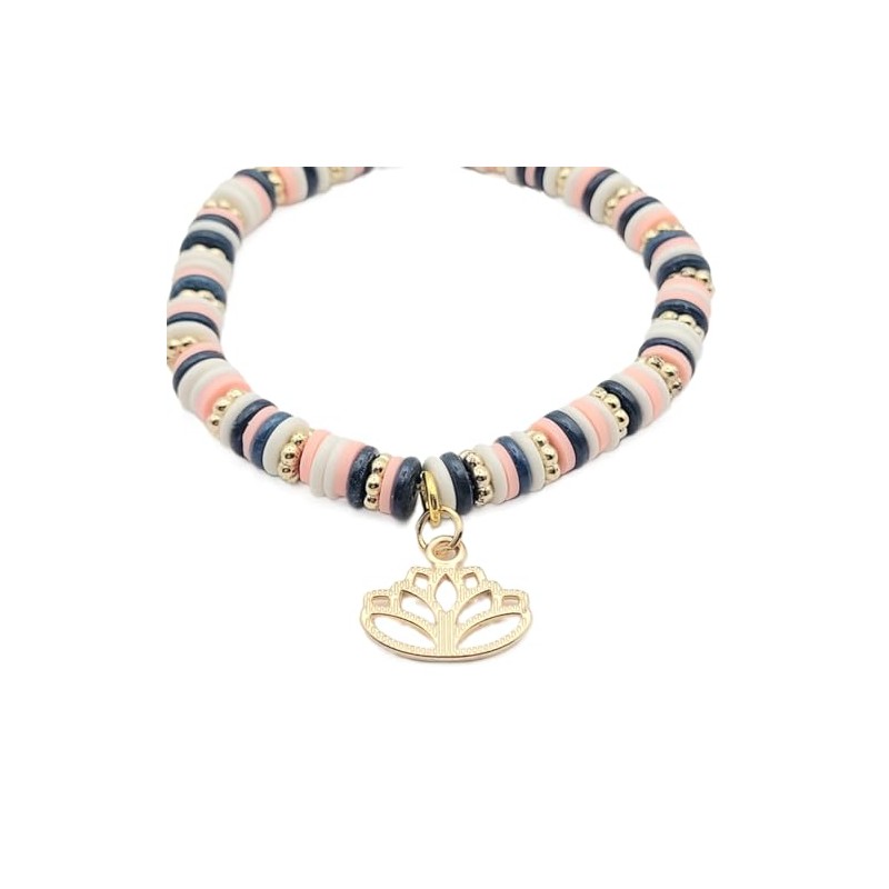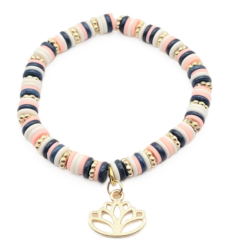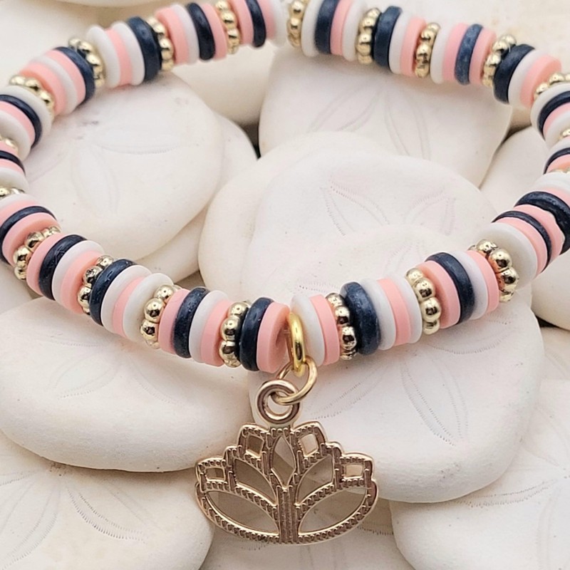 Polymer Clay and Snow Jade Heishi Bead Stretch Bracelet - Tranquil Blooms - Navy Blue Coral White Silver for Summer Beach Boho Friendship - Lotus Flower Charm - Handmade