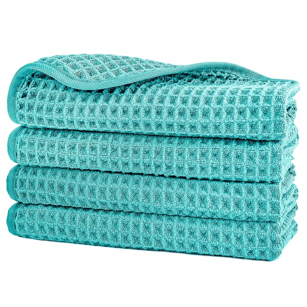 POLYTE Microfibre Lint Free Washcloth Face Towel, 33 x 33 cm, 4 Pack (Aqua, Waffle Weave)