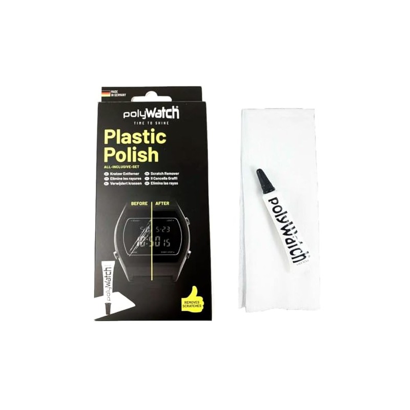 - PolyWatch scratch remover polish tube with cloth.