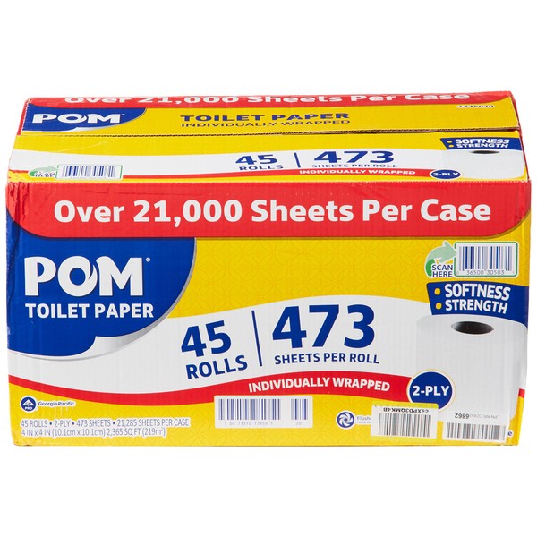 POM Pom Embossed 2-ply Toilet Paper, White, 45 Rolls, 473 Sheets