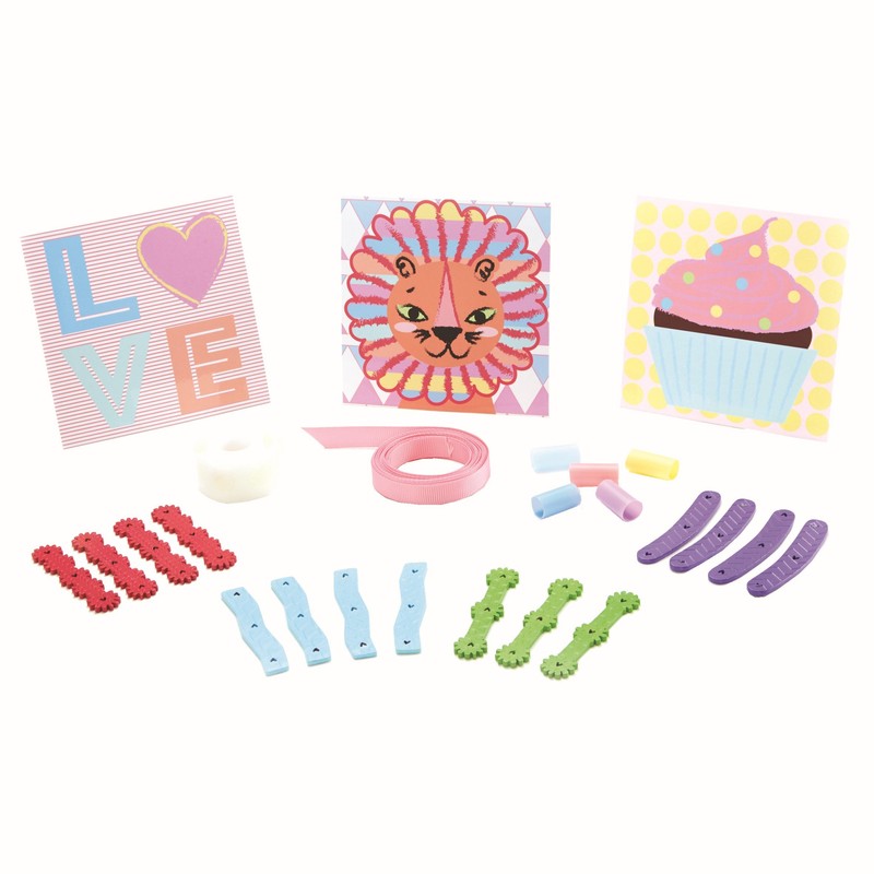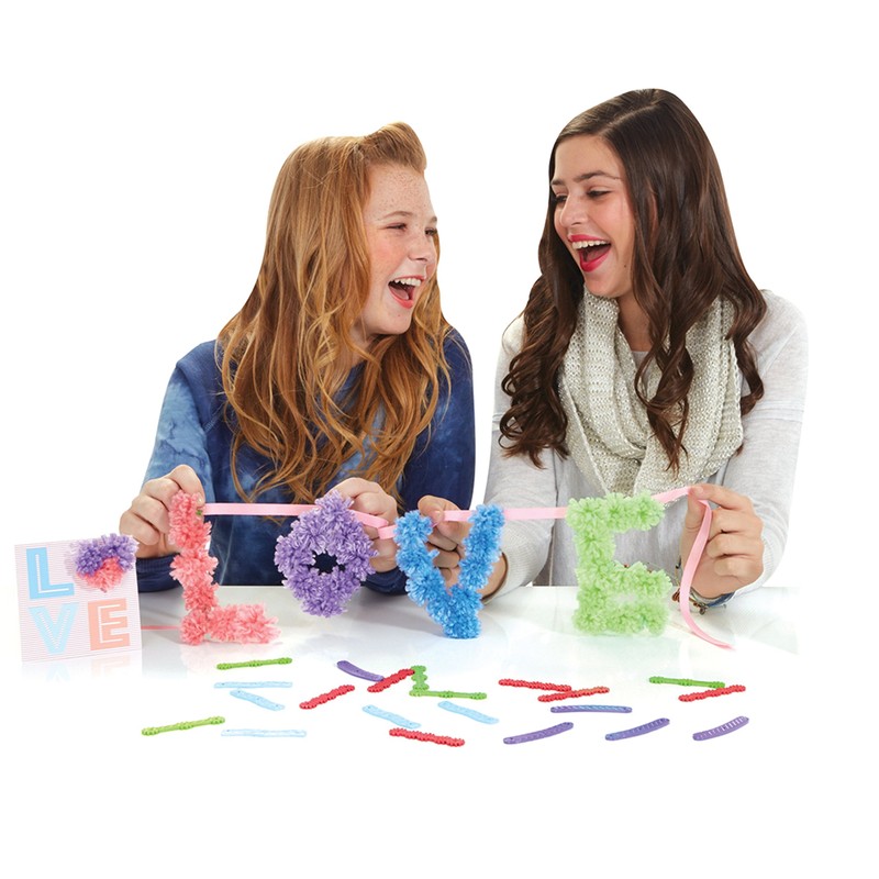 - The Snap and Decorate Set comes with 18 plastic letter snaps in 4 colors, 50 pom poms in 5 colors, 1 roll of yarn, 3 decorative cards, and 60 adhesive dots.