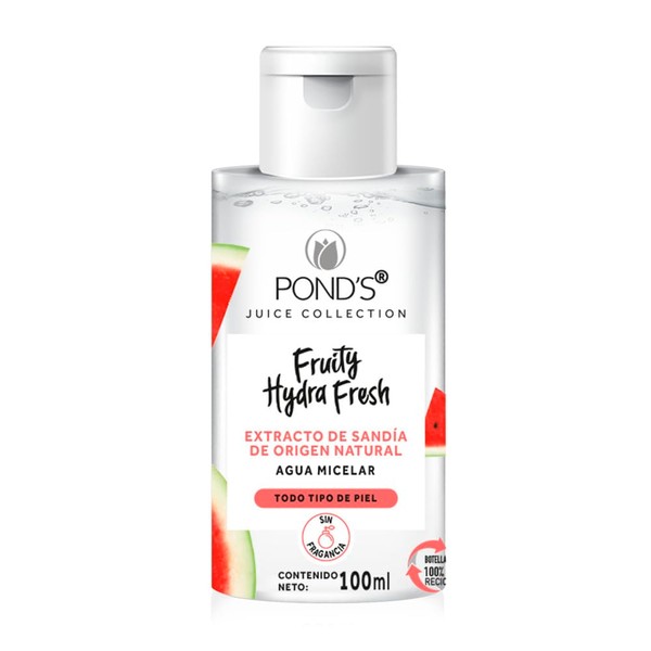 Nueva Agua Micelar Pond's Fruity Hydra Fresh Sandía que limpia y remueve suavemente el maquillaje del rostro. Fórmula con agua triplemente purificada y con sandía de origen natural ideal para todo tipo de piel, dejándola radiante y luminosa. El complemento ideal para tu rutina de skin care ¡Cuida y protege tu piel con Pond's!