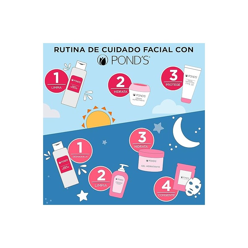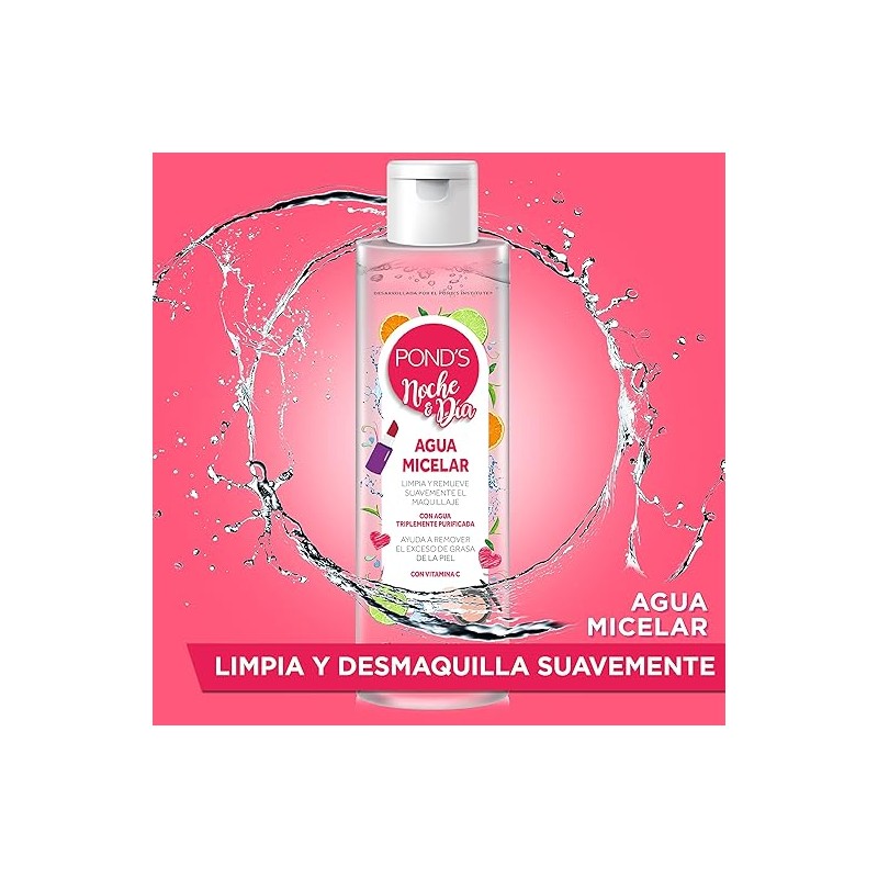 Agua Micelar Noche & Día POND'S para piel balanceada a grasa. Su fórmula es reconocida por su eficaz poder de limpieza, actúa hacia adentro* limpiando y removiendo de manera profunda* y suave el maquillaje del rostro, para poder ver y sentir una piel limpia, libre de maquillaje y sin irritarte por fuera.* La forma más pura de limpiar la piel, con agua triplemente purificada. Contiene ingredientes humectantes y vitamina C. Recuerda hacer tu rutina de limpieza facial diariamente !Cuida y protege tu piel con POND'S! *Estrato Córneo.