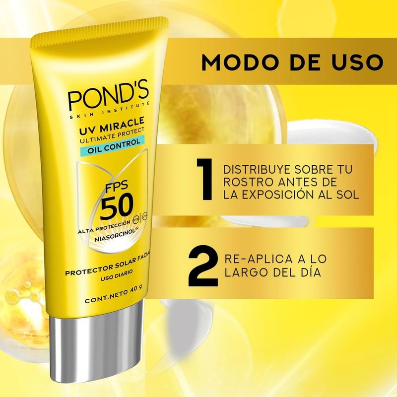 El UV Miracle Oil Control de POND’S es un protector solar facial con FPS 50 , especialmente formulado para piel grasa. Su fórmula en gel ultraligera contiene Niasorcinol™ , un potente complejo que ayuda a reducir las manchas, controlar la producción de grasa y minimizar el brillo facial.