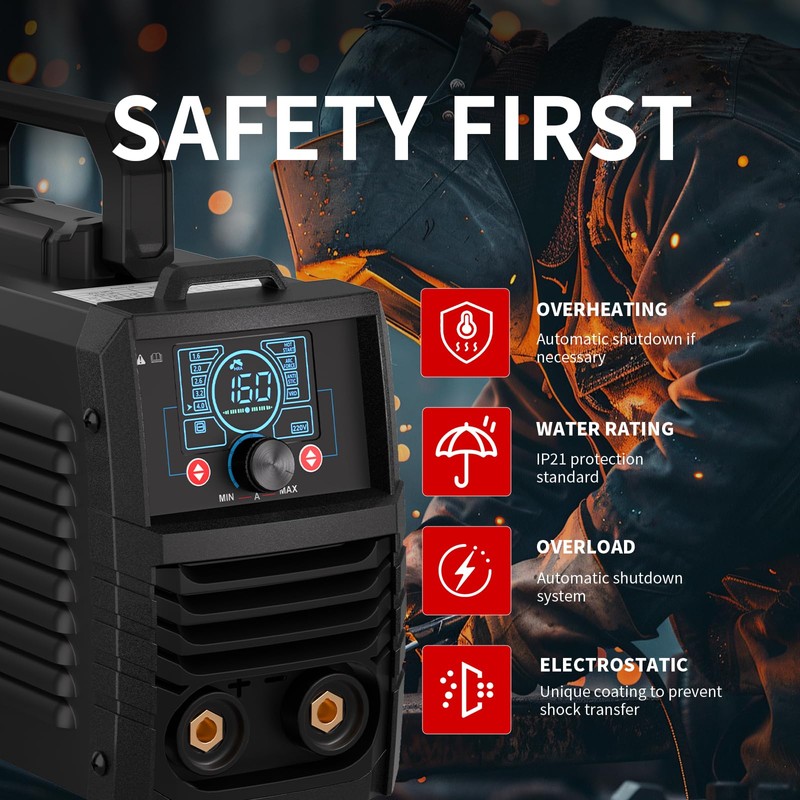 - Large LED display: The intelligent LED display on the ARC welding machine gives you a clear view of current, electrode size, function mode and welding mode, even without removing the mask. The electrode caliber and function can be freely selected on the screen and the machine parameters are automatically matched for safety and convenience.