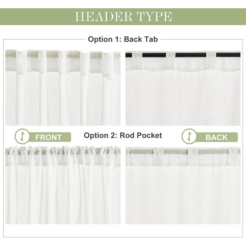 - Ready Made - Sold per pair, including 2 linen sheer panels - Panel measures: 52(104"W for pair)x 102 inches. Each panel is rod pocket & back tab loops top design, which Can be hung traditionally from the top or can be flipped and hung with a decorative rod through the 2.8" rod pocket