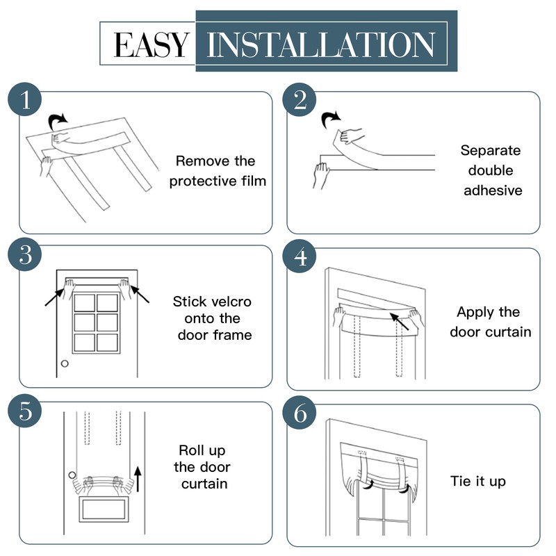 - Effortless Installation: No rods No tools No drilling.Please follow our instruction paper, just stick straps to the door frame and paste the sticky stickers to the straps.You can tie up the curtain with straps attached for sightseeing or tie it down for full privacy.