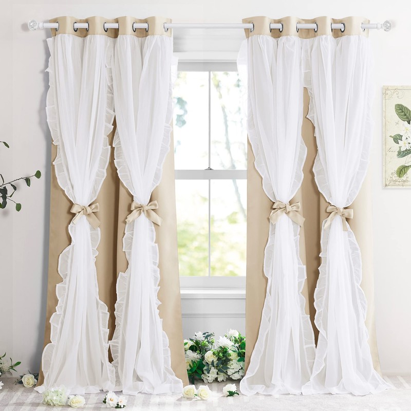 PONY DANCE Ruffle Curtains Double Layers Sheer Overlay Elegant Decoration for French Country Rustic Design Window Covering with Tiebacks, 52" Wide x 95" Long, Biscotti Beige, 2 Panels
