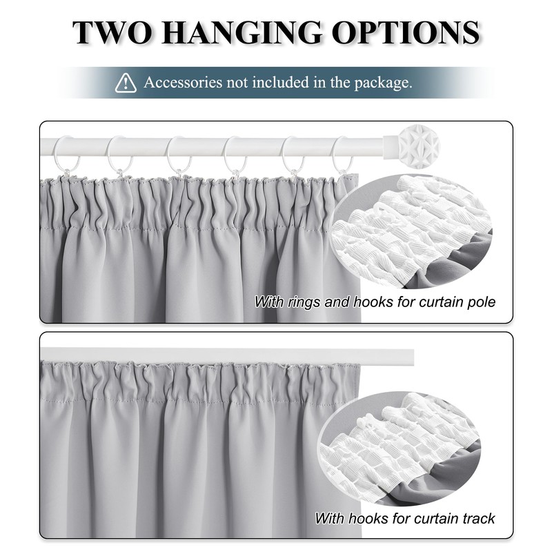 • Easy Installation - There are two methods for hanging: 1. Hanging with curtain rings and hooks on the curtain pole. 2. Hanging with curtain hooks on the curtain track. Suitable for curtain pole and curtain track rail.