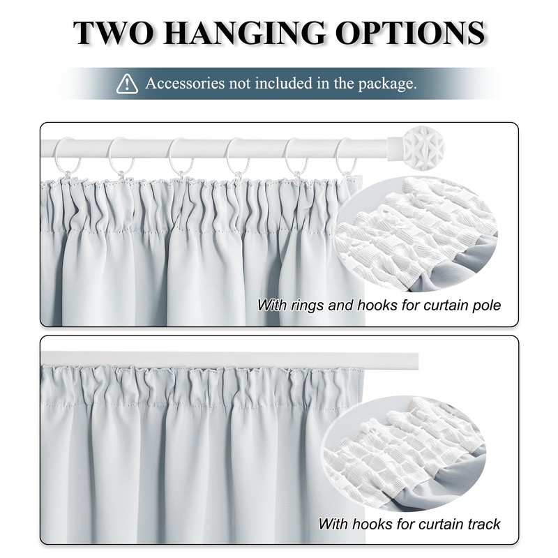 - Easy Installation - There are two methods for hanging: 1. Hanging with curtain rings and hooks on the curtain pole. 2. Hanging with curtain hooks on the curtain track. Suitable for curtain pole and curtain track rail.