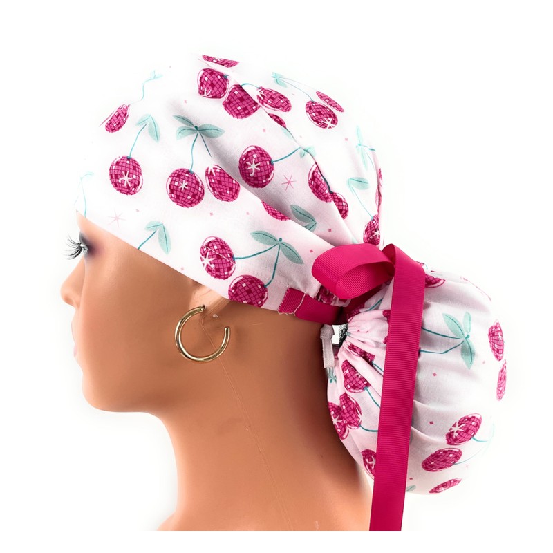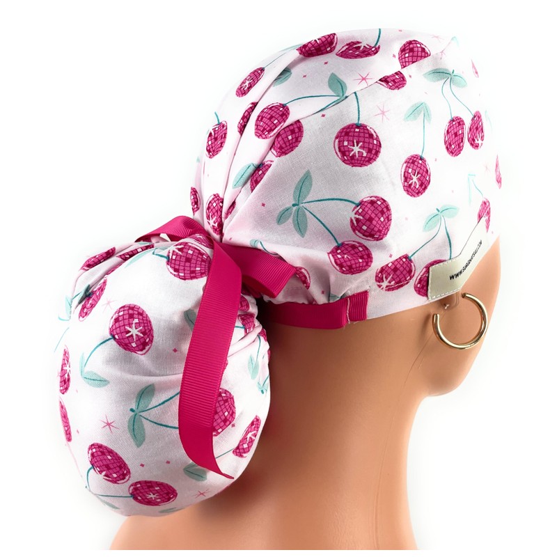 Ponytail Medical Scrub Cap – Disco Cherries – Dr. Hats, Nurses Hats. Scrub Hat for Women Blue