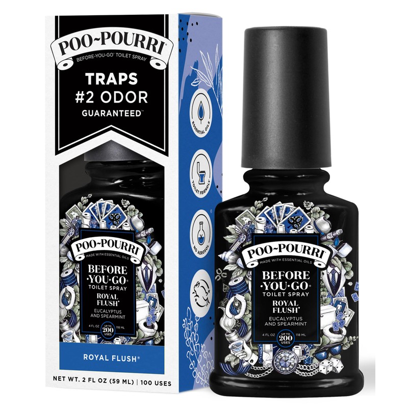 - Spritz the bowl before-you-go and no one else will ever know; our most popular scent! A great washroom scent for distinguished gents! Sometimes you have to raise the stakes to win the pot. Poo~pourri Royal Flush is a blend of eucalyptus and spearmint natural essential oils that eliminates bathroom odor before it begins by creating a barrier on the water's surface. So you'll always have an ace in the hole.