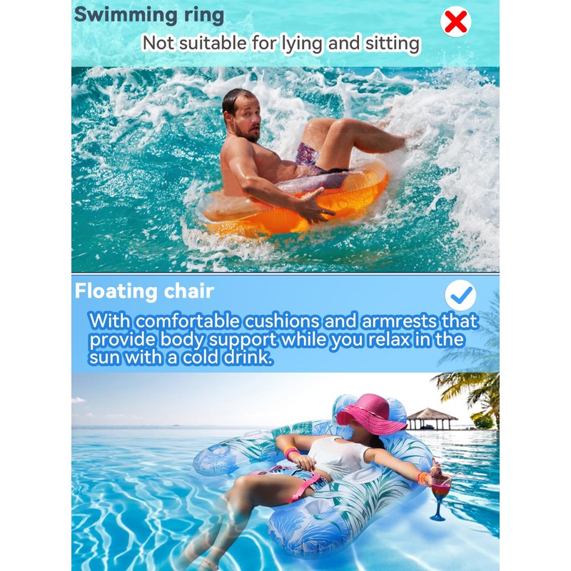 - 【More Comfortable】Our lake water float chairs have been upgraded with a product, and the head of the chair floaties for adults has a semi-arc design, which is more ergonomic. And not easy to fall over or tilt, so you can feel the most comfortable experience in the pool. Tips: This inflatable pool seat is not a life-saving swim gear, and can only be used as a water play toy.