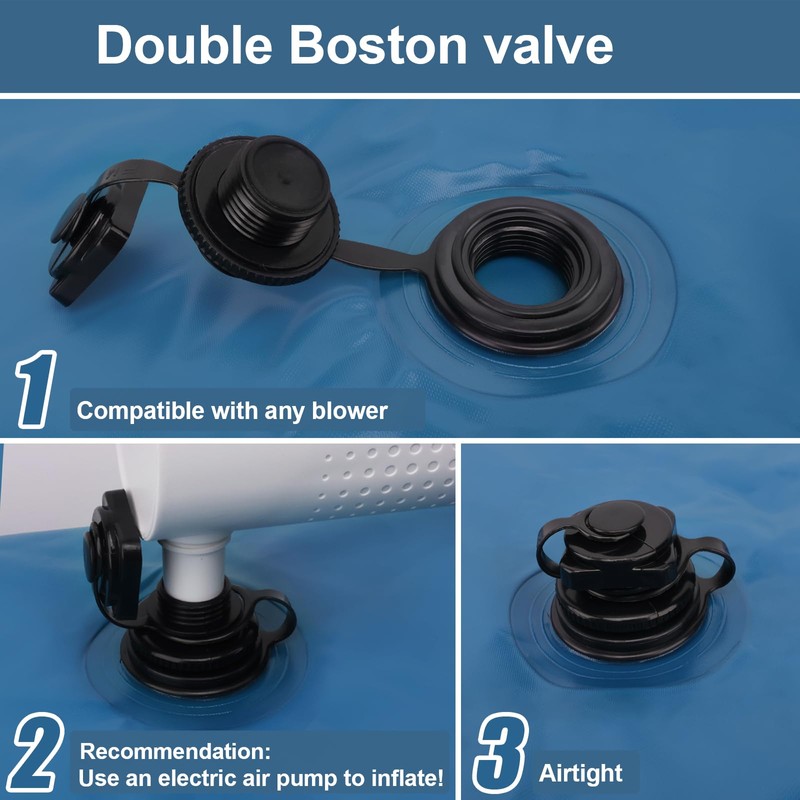 - 【Easy to Inflate and Deflate】: Double Boston valves are compatible with most air blowers, can be easily inflated and deflated, and the safety valve has a good seal to prevent air leakage. Good edge sealing technology, the pool mat does not leak, airtight.