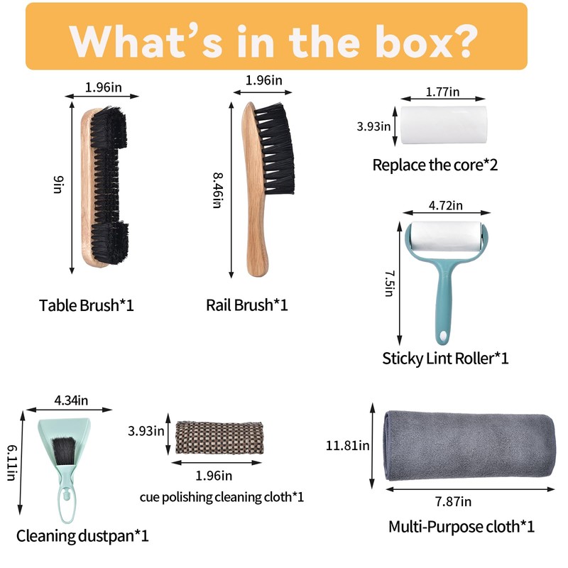 - You will receive 1x pool Table Brush, 1x Rail Brush, 1x Cue Cleaning Cloth, 1x Multi-Purpose cleaning cloth, 1x Cleaning dustpan set, 1x Sticky Lint Roller for Felt, 2x Spare Core.
