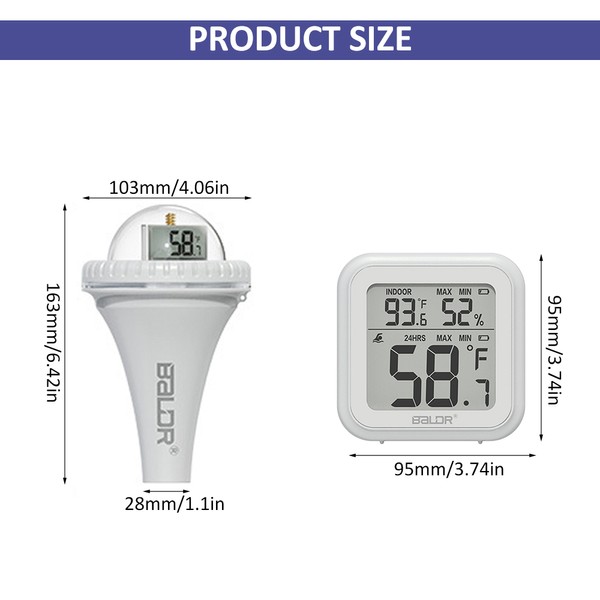 1、[Wireless Pool Thermometer] The maximum connection distance is 300 feet(90M). You can check temperature readings with the receiver inside home. 2、[Accurate Reading] Support both Fahrenheit and Celsius readings.Update temperature data every 3 minutes. 3、[Premium Material] The thermometer has adopted great materials, it is solid and High strength. 4、[PX7 Water Resistant] The thermometer is ideal for swimming pools, Fish Ponds, aquariums, baby baths, spas, etc. Pool thermometer floating easy read, measurement range: -9.9°C-50°C (14F-122℉). 5、[Easy To Read] The top hemispherical transparent protective shell and LCD vertical structure make it easier to read temperature on water.